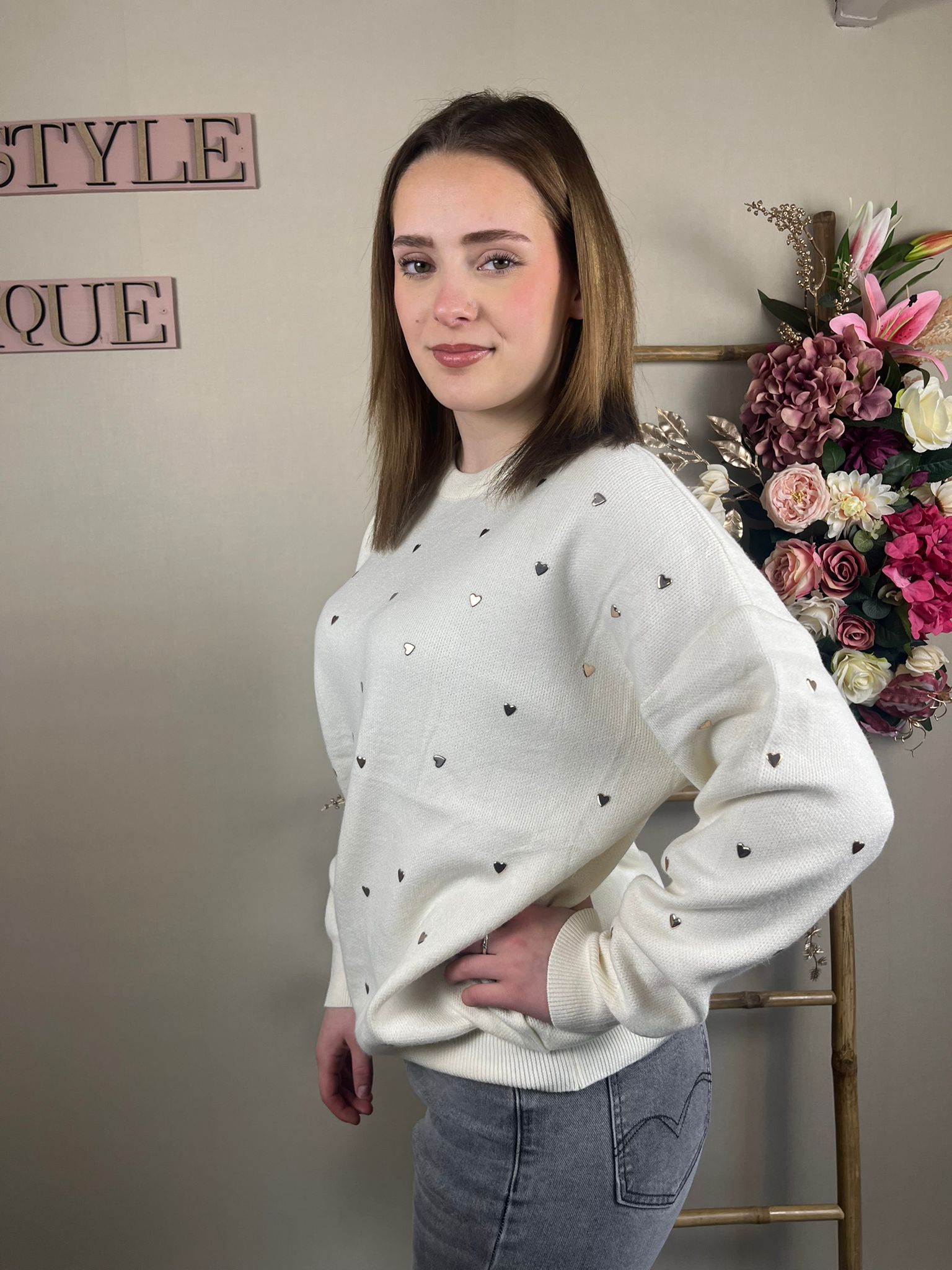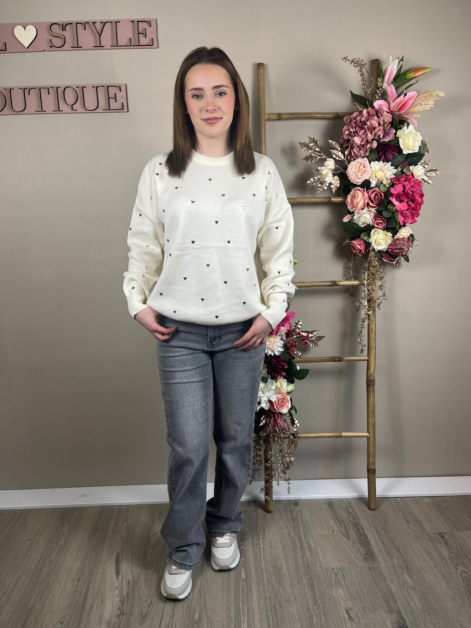 Crème-kleurige trui met speelse hartjes die subtiel óp de stof zijn aangebracht voor een unieke, stijlvolle look. Heerlijk zacht, comfortabel en makkelijk te combineren – een tijdloze favoriet met een verfijnde, romantische touch.