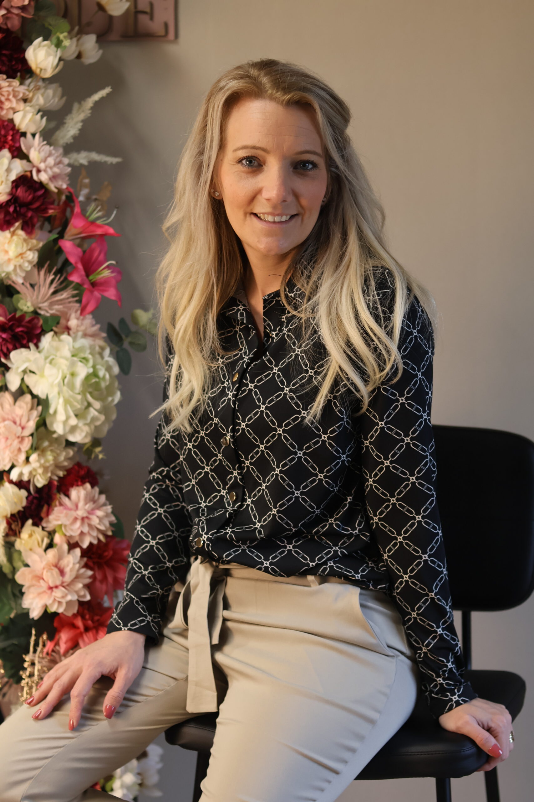 Deze elegante zwart-beige blouse combineert tijdloze stijl met een vrouwelijke, getailleerde pasvorm. De blouse heeft een klassieke kraag, lange mouwen en sluit met een rij knopen aan de voorkant. De subtiele kleurcombinatie van zwart en beige zorgt voor een chique uitstraling die zowel geschikt is voor kantoor als voor een nette casual outfit. Makkelijk te combineren met een pantalon, rok of jeans voor een veelzijdige en stijlvolle look.
