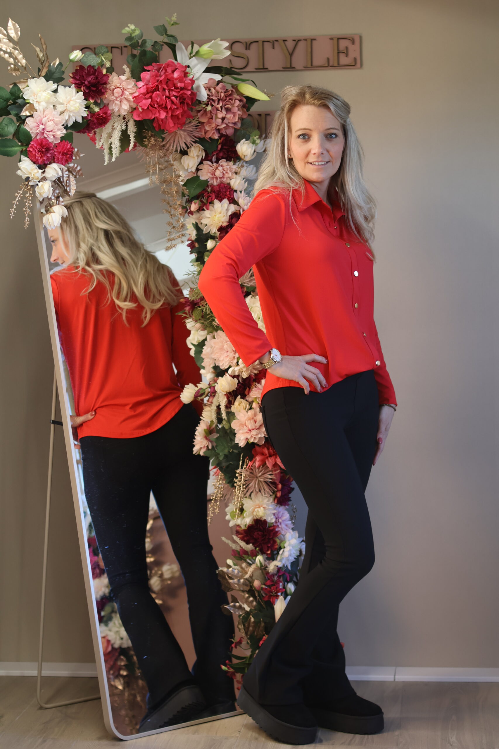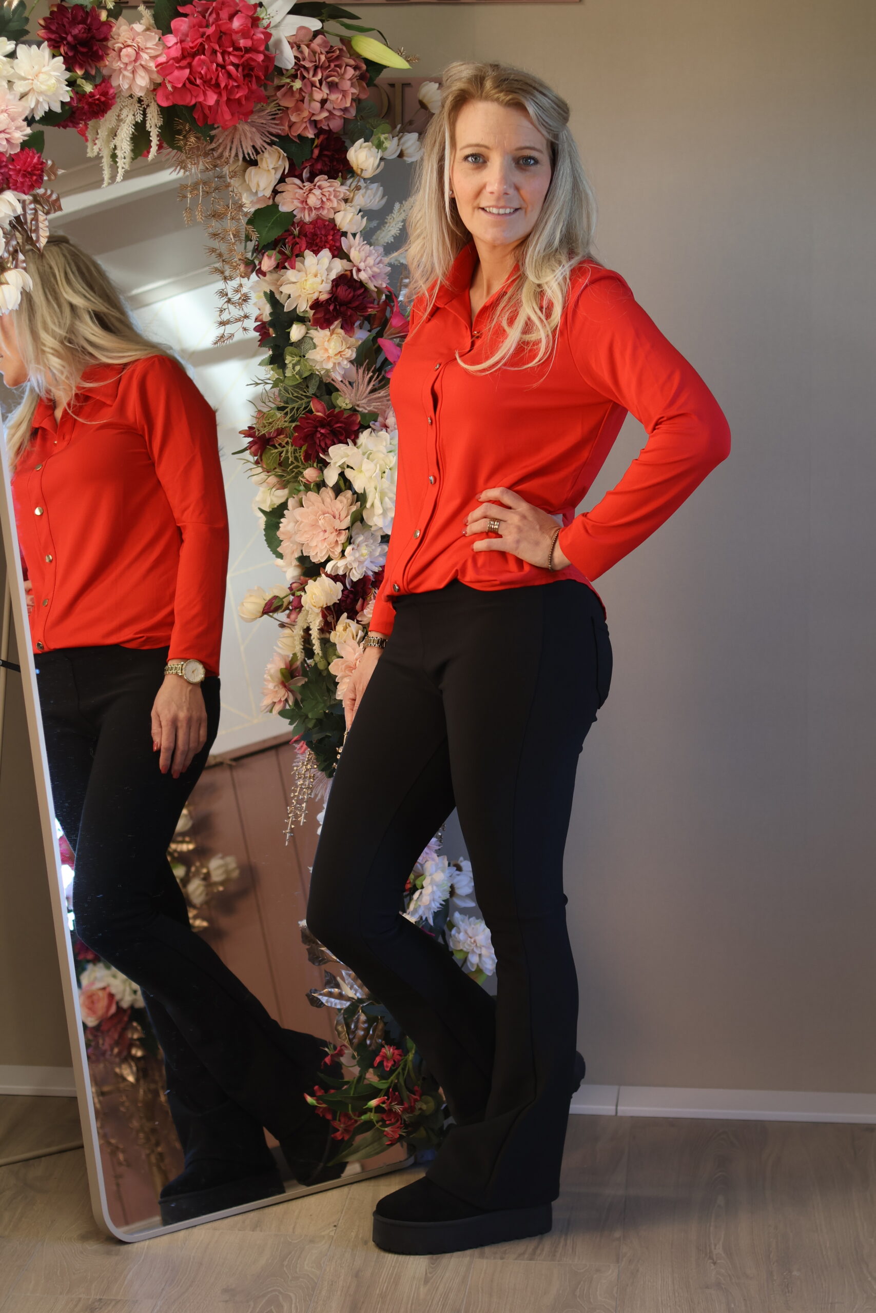 • Statement kleur – het rood geeft je outfit direct uitstraling en zelfvertrouwen
