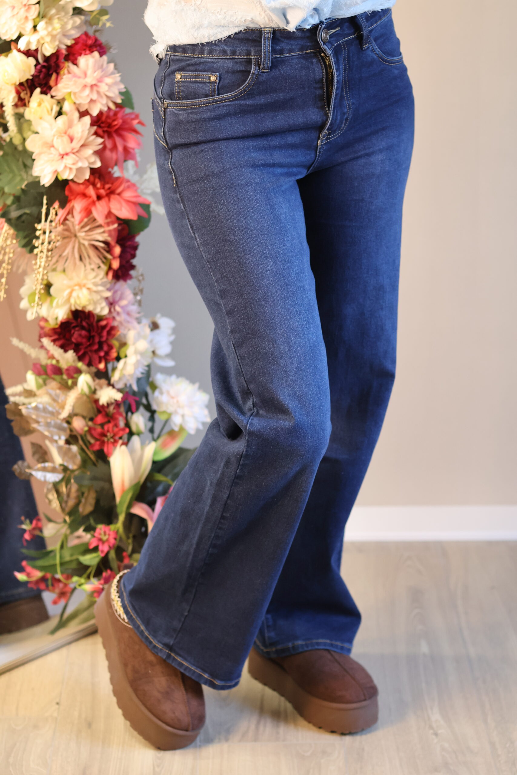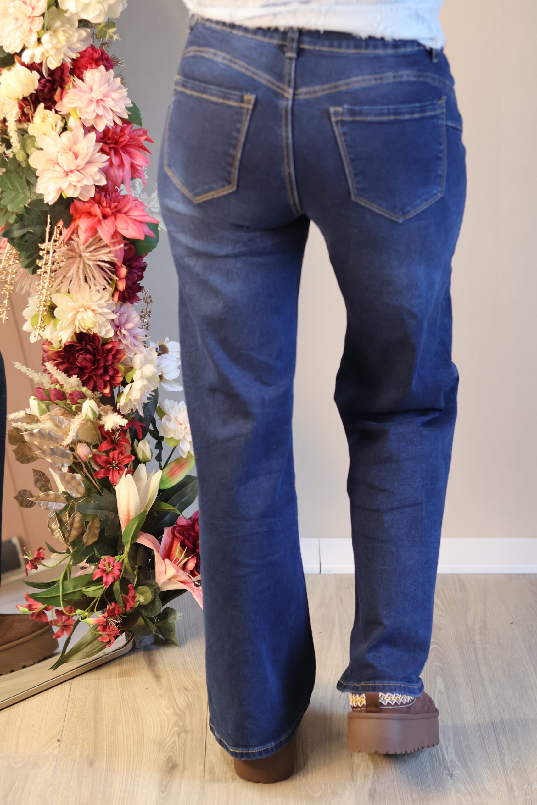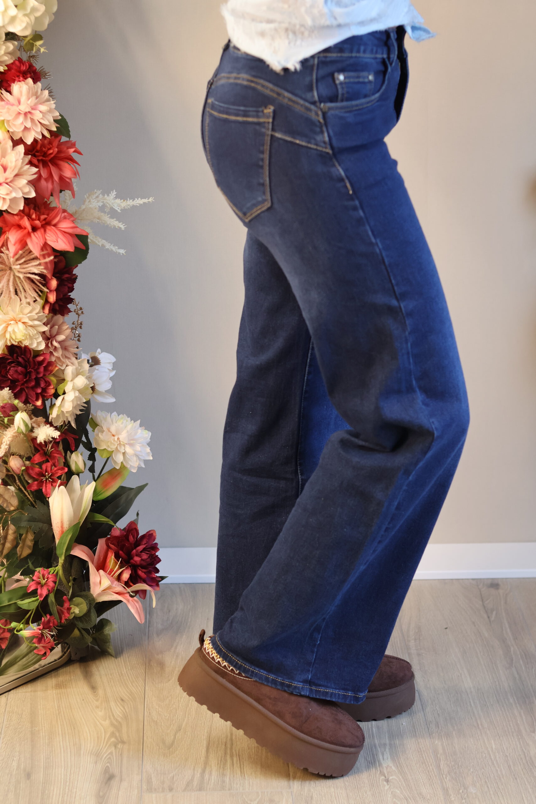 Donkerblauwe jeans met een comfortabele pasvorm en licht uitlopende pijpen. Tijdloos, flatterend en perfect voor elke dag.
