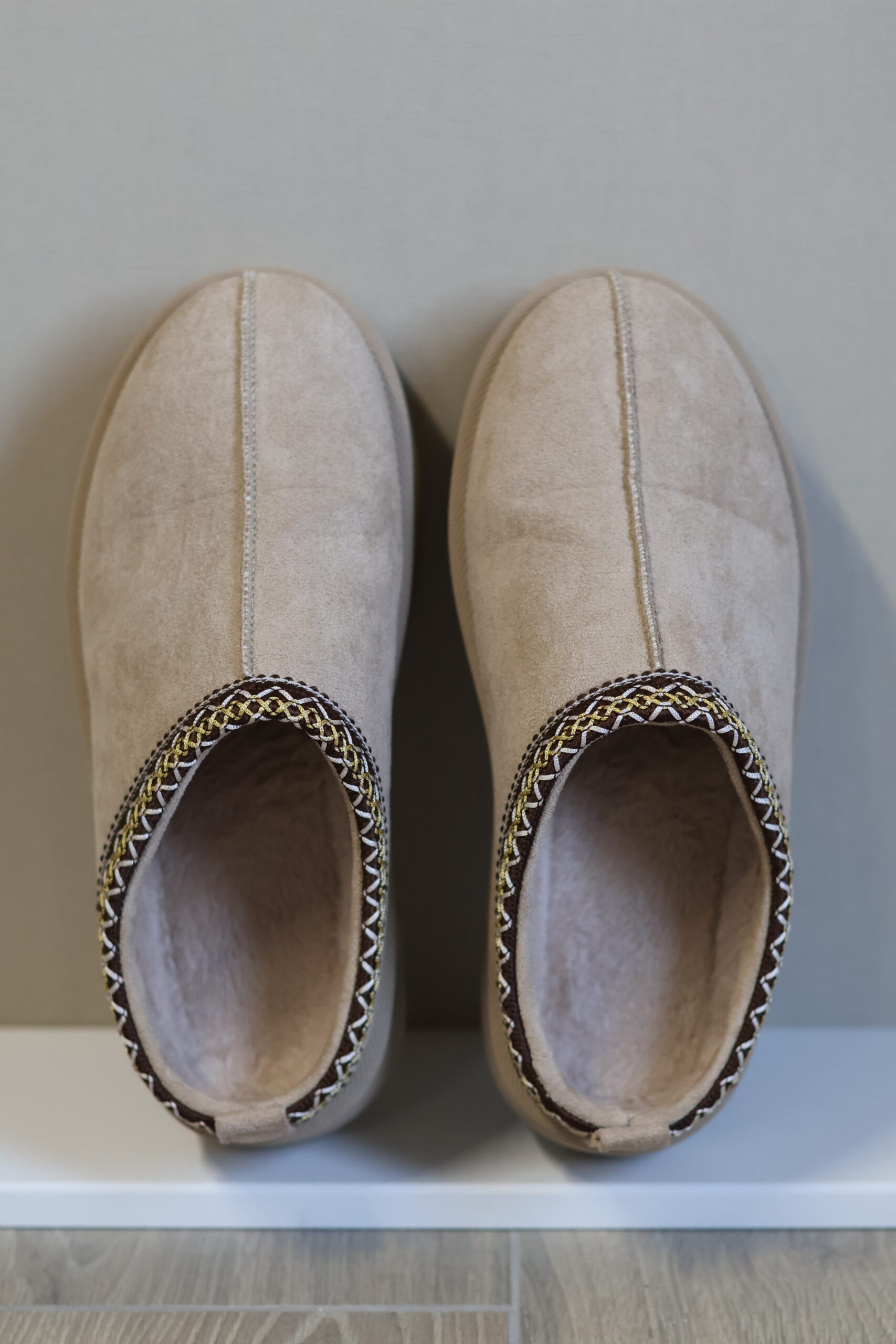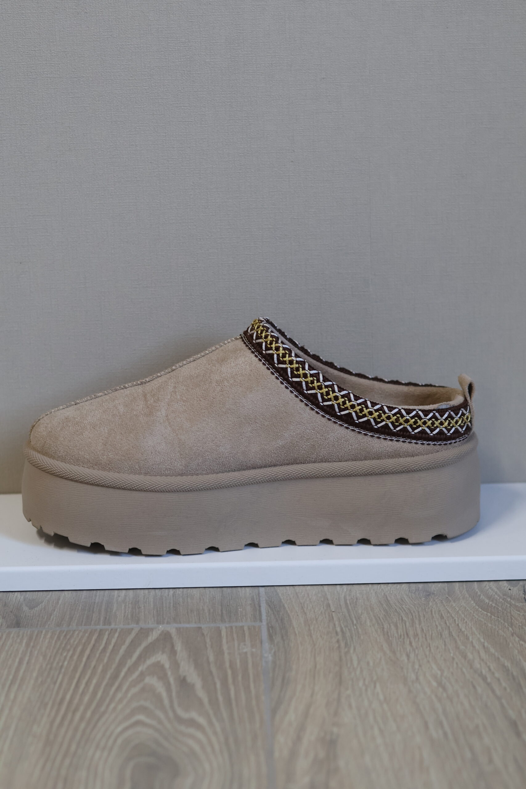 Deze beige instappers combineren comfort en stijl in één. De zachte, suède-look afwerking geeft de schoenen een warme en luxe uitstraling, terwijl de stevige plateauzool zorgt voor een moderne touch én extra comfort tijdens het lopen.