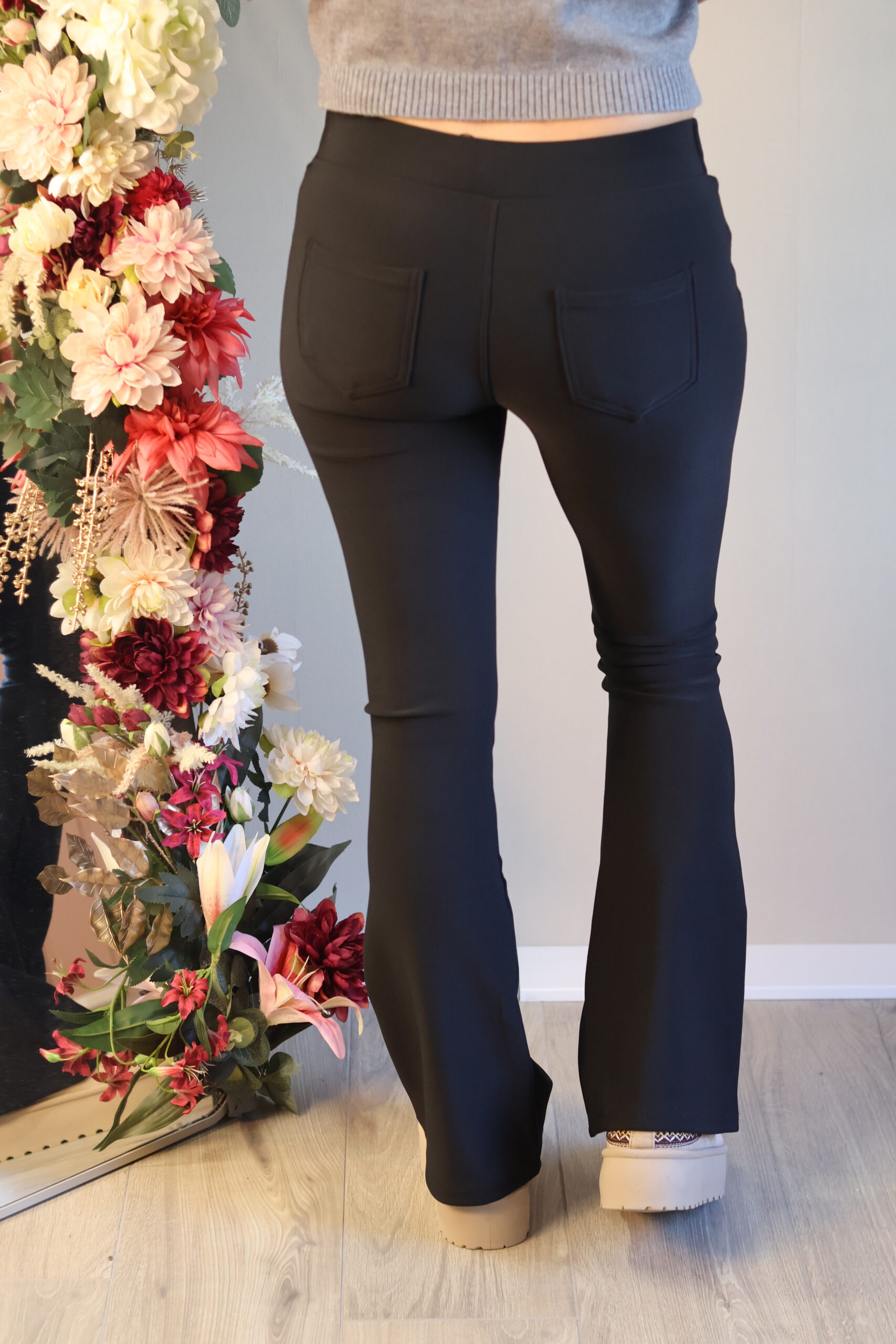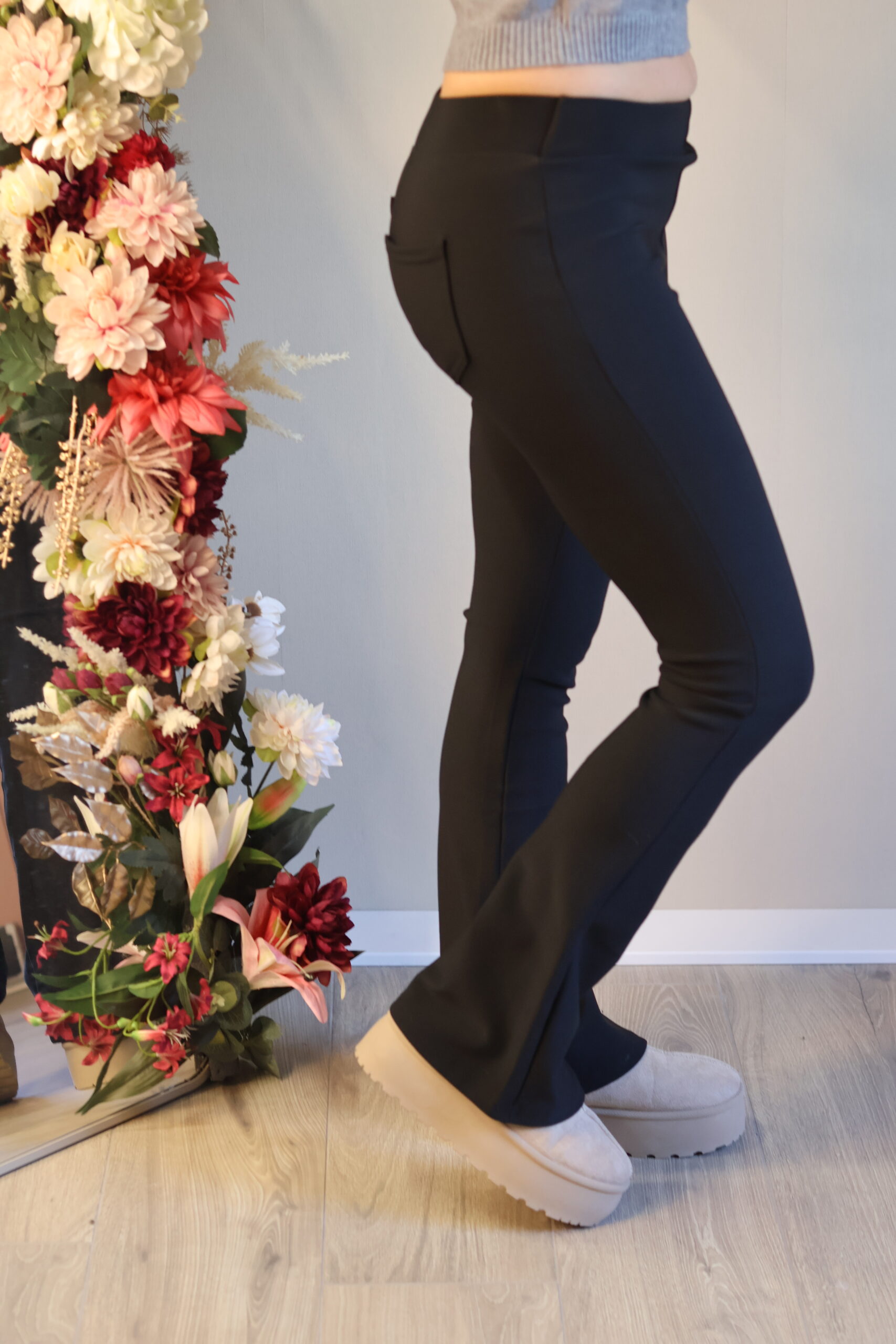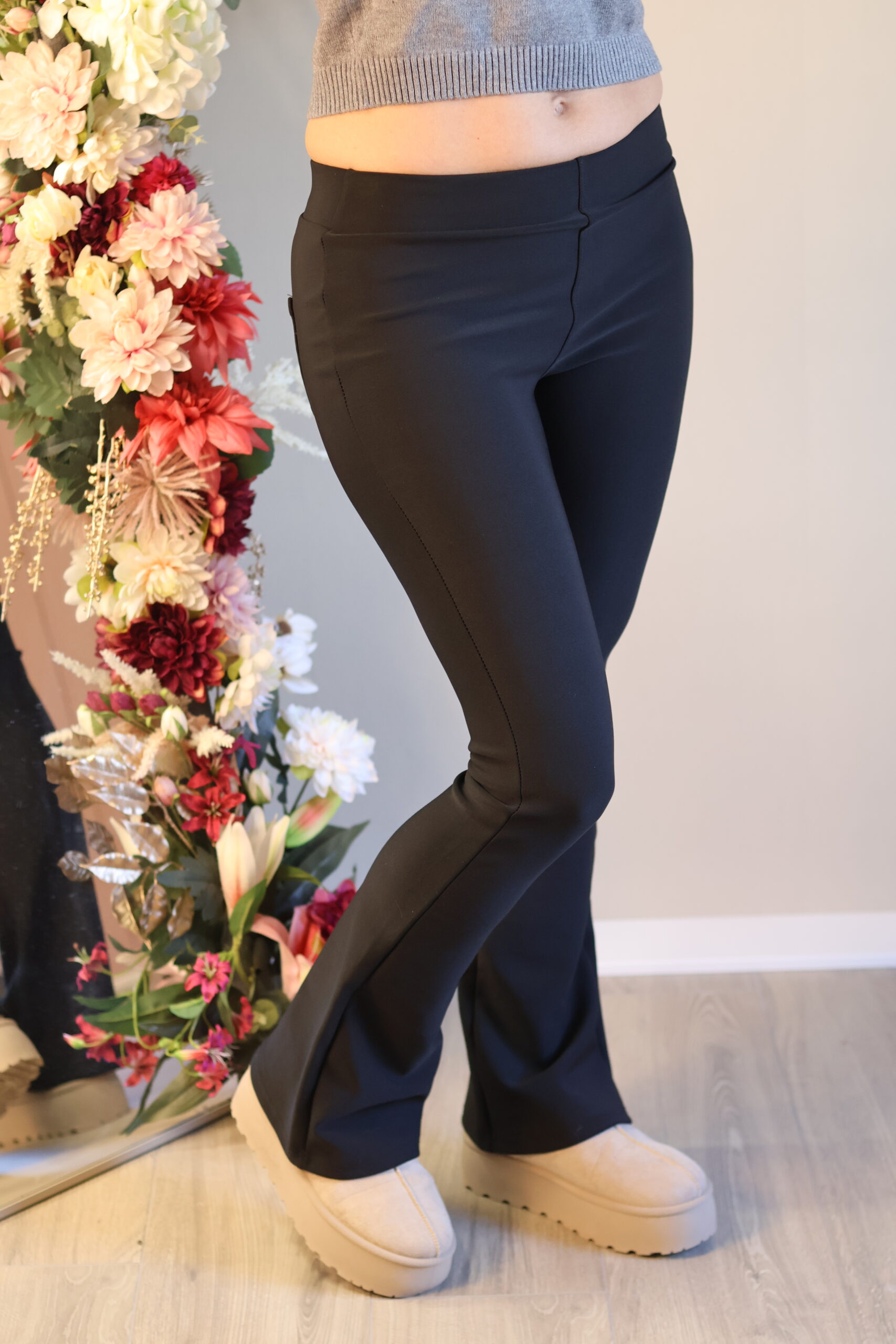 Zwarte flair broek met flatterende pasvorm, elastische taille en stijlvolle achterzakken.