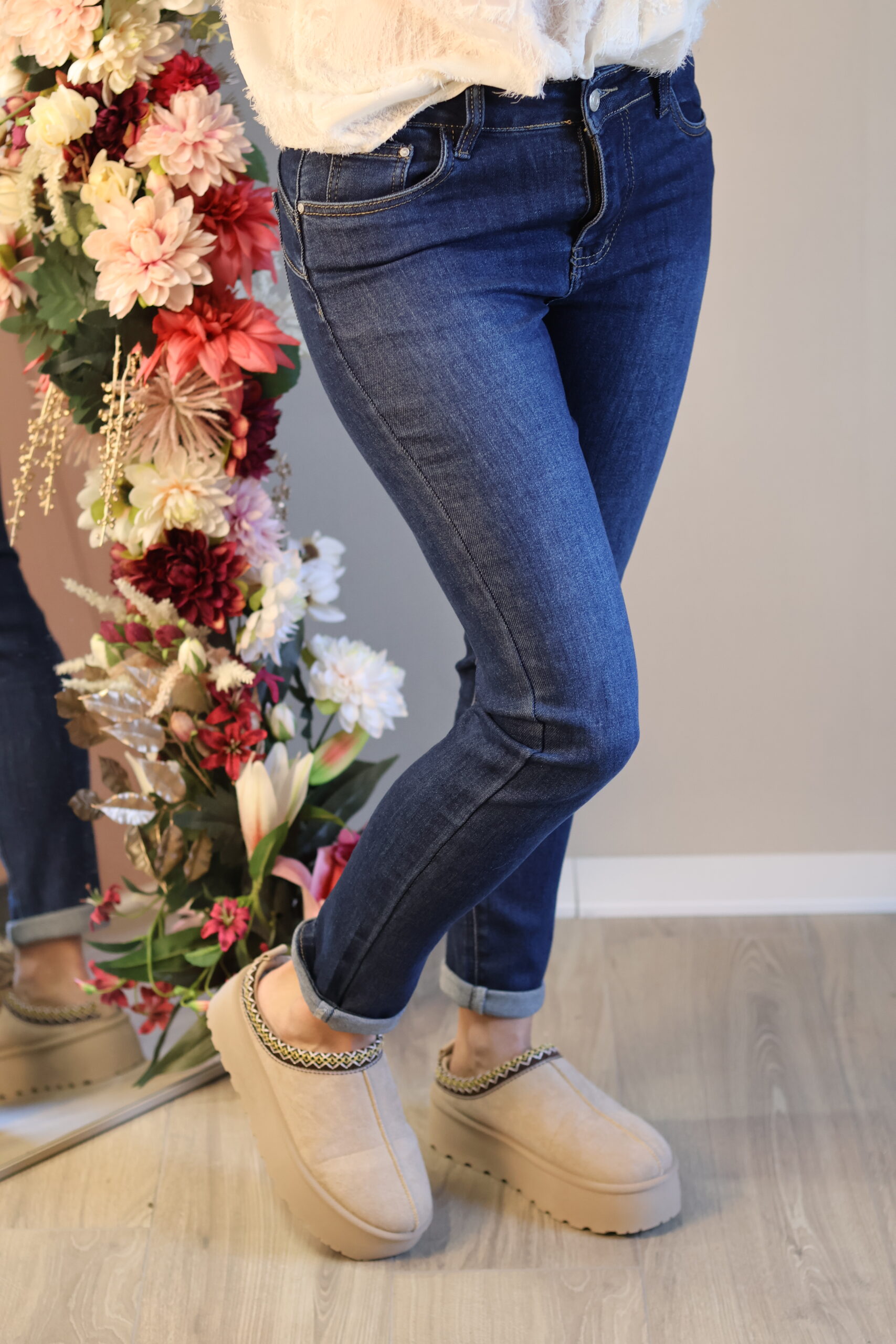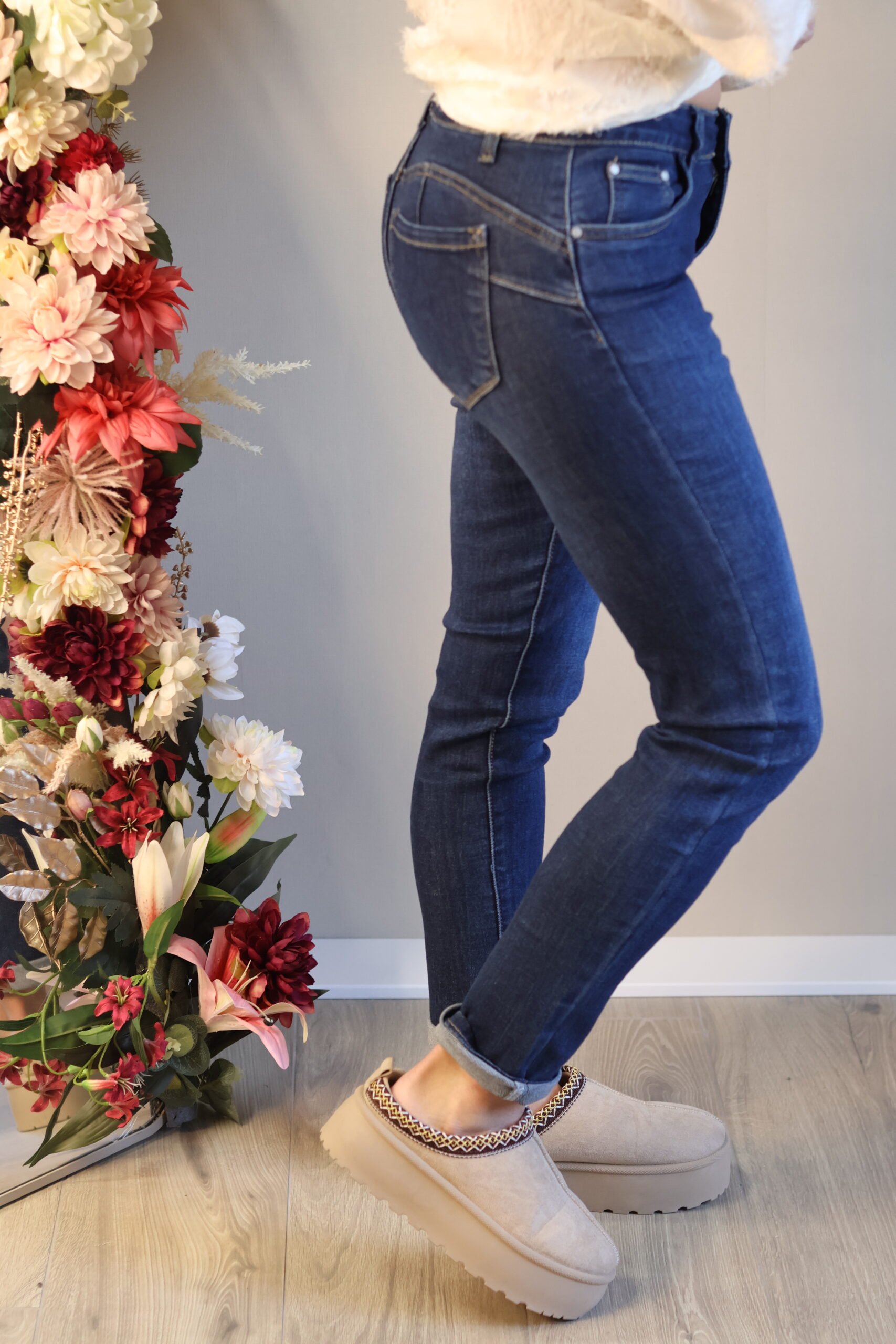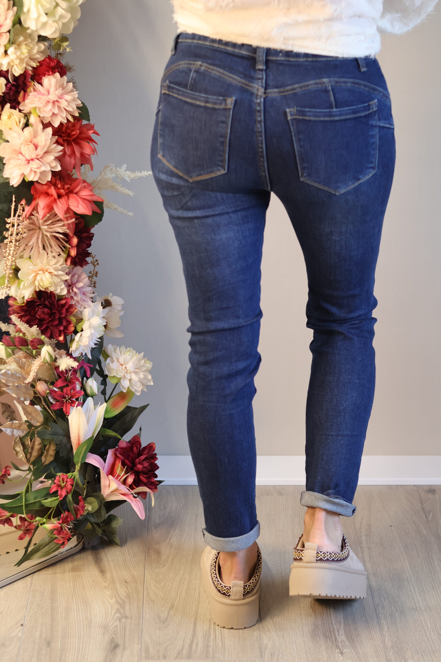 Deze donkerblauwe skinny spijkerbroek is een echte wardrobe essential. De nauwsluitende pasvorm accentueert de benen op een flatterende manier, terwijl de lichte stretch in de stof zorgt voor comfort en bewegingsvrijheid. De diepe indigo tint maakt de jeans veelzijdig en makkelijk te combineren — van casual met sneakers tot chic met hakken en een blazer. Een stijlvolle, tijdloze jeans die geschikt is voor elke gelegenheid en seizoen.