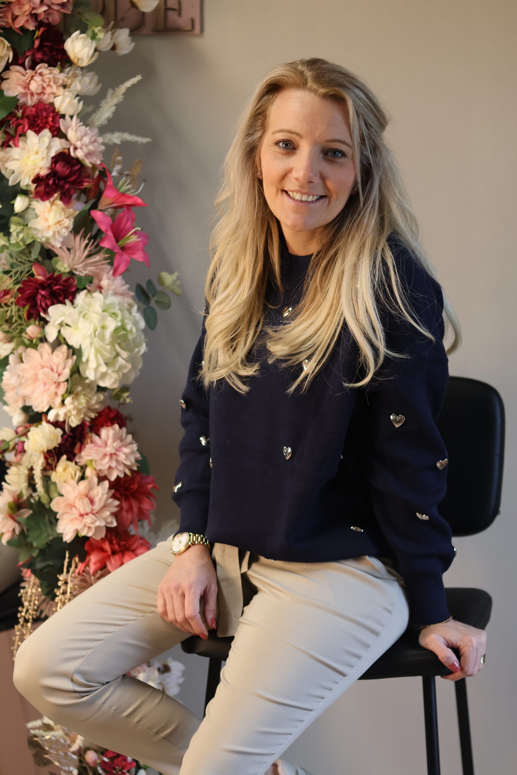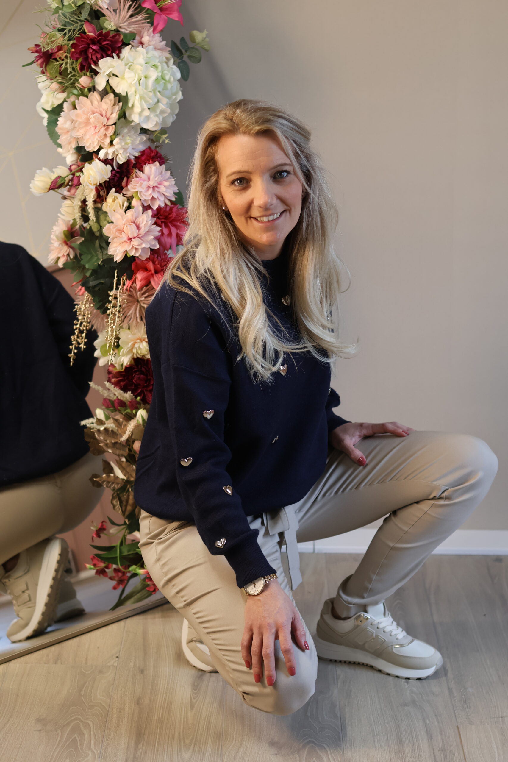 Blauwe trui met speelse gouden hartjes all-over print. Zacht, comfortabel en perfect voor een vrouwelijke, vrolijke look.