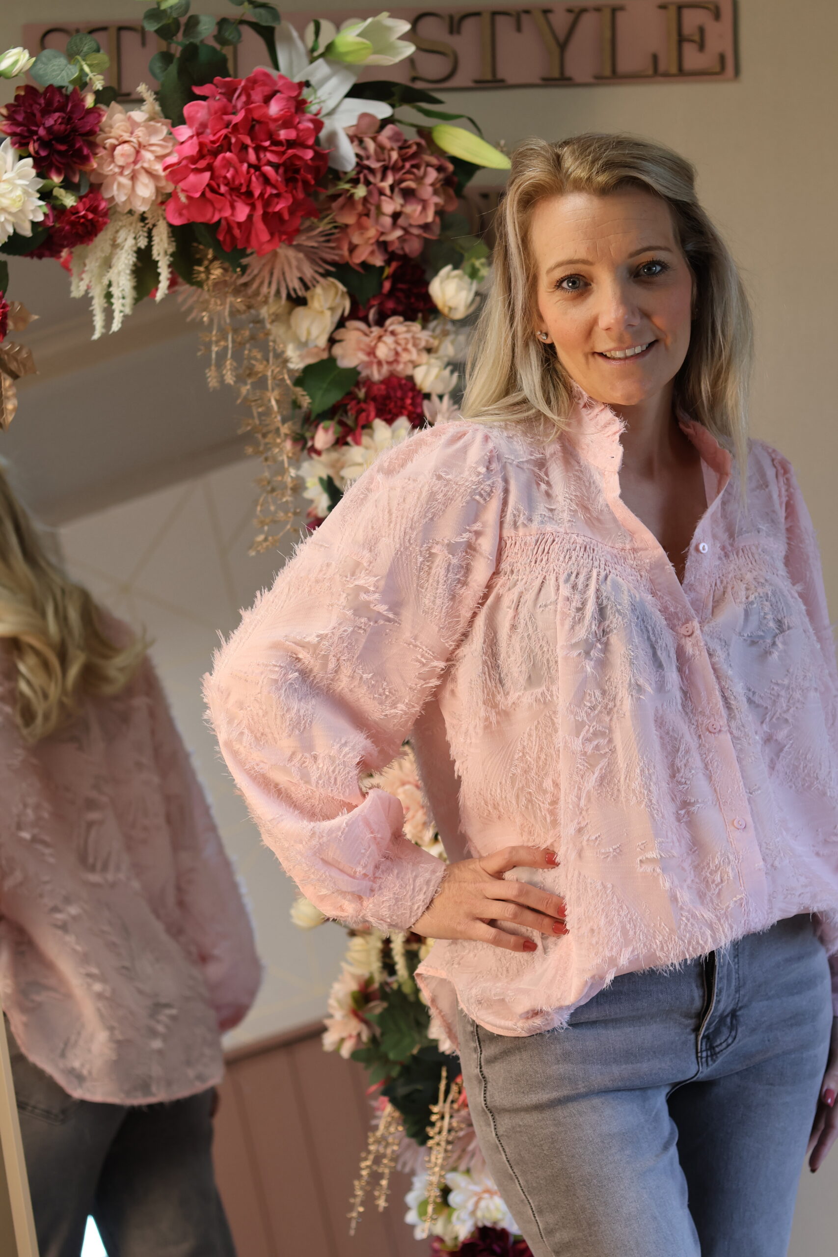 Lichtroze blouse met subtiele structuur en elegante details. Een vrouwelijke en stijlvolle toevoeging aan elke outfit.