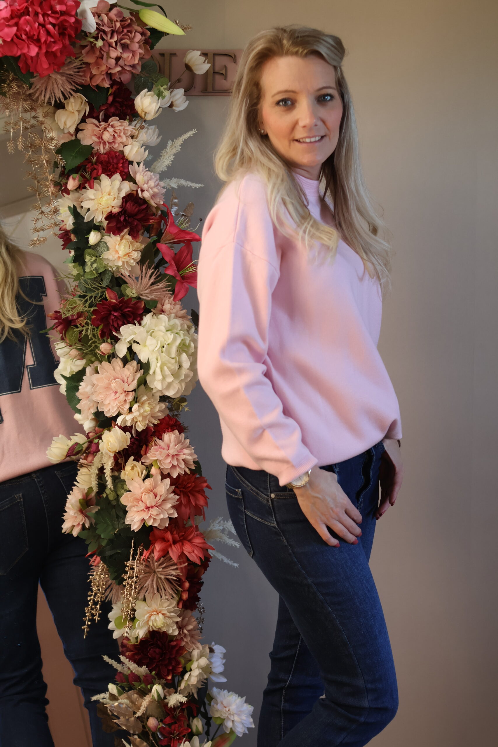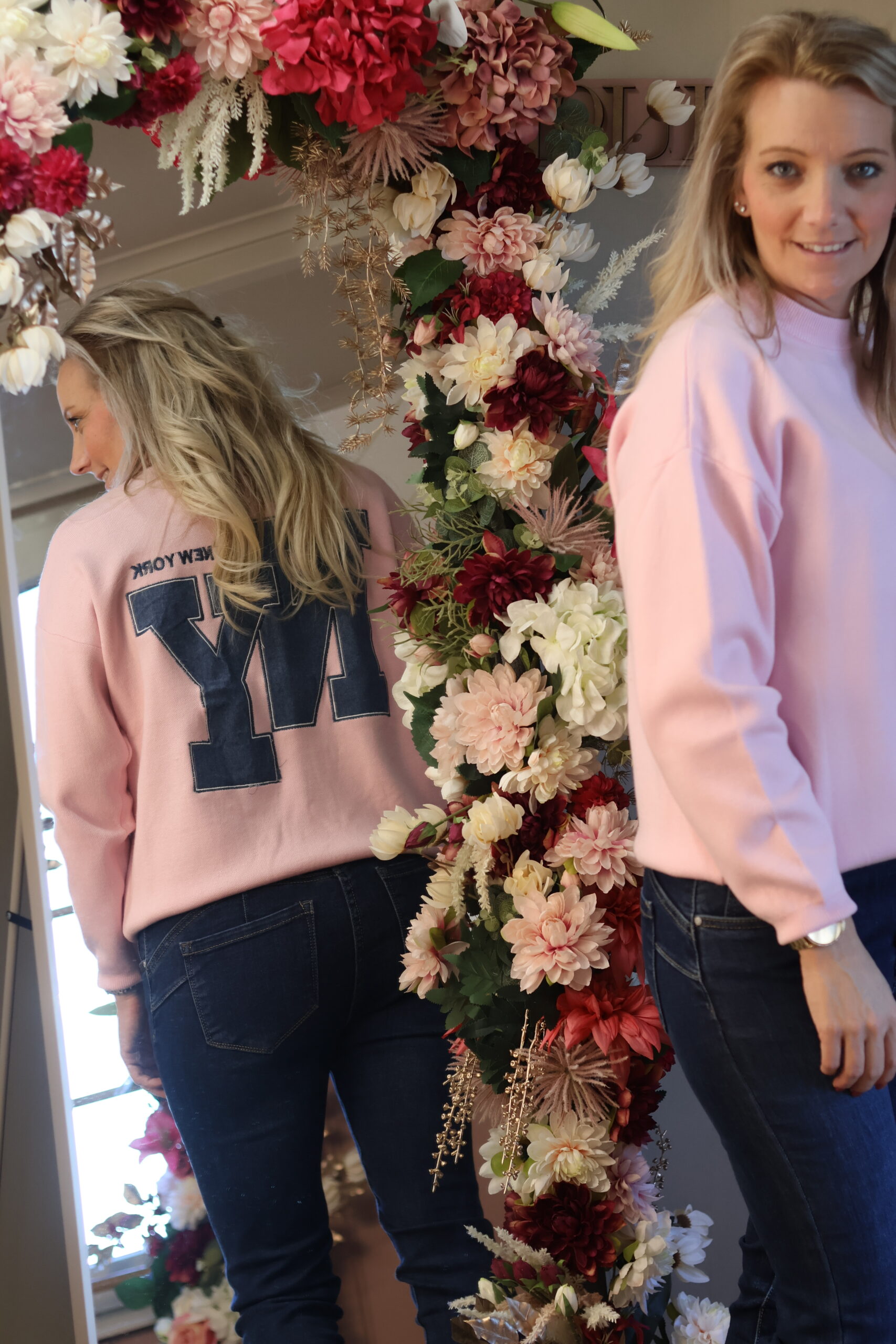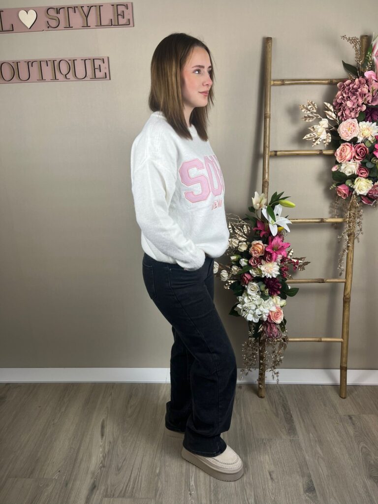 Comfortabele roze sweater met een relaxed fit en een opvallende letterprint op de achterkant. Perfect voor een casual, stijlvolle look.