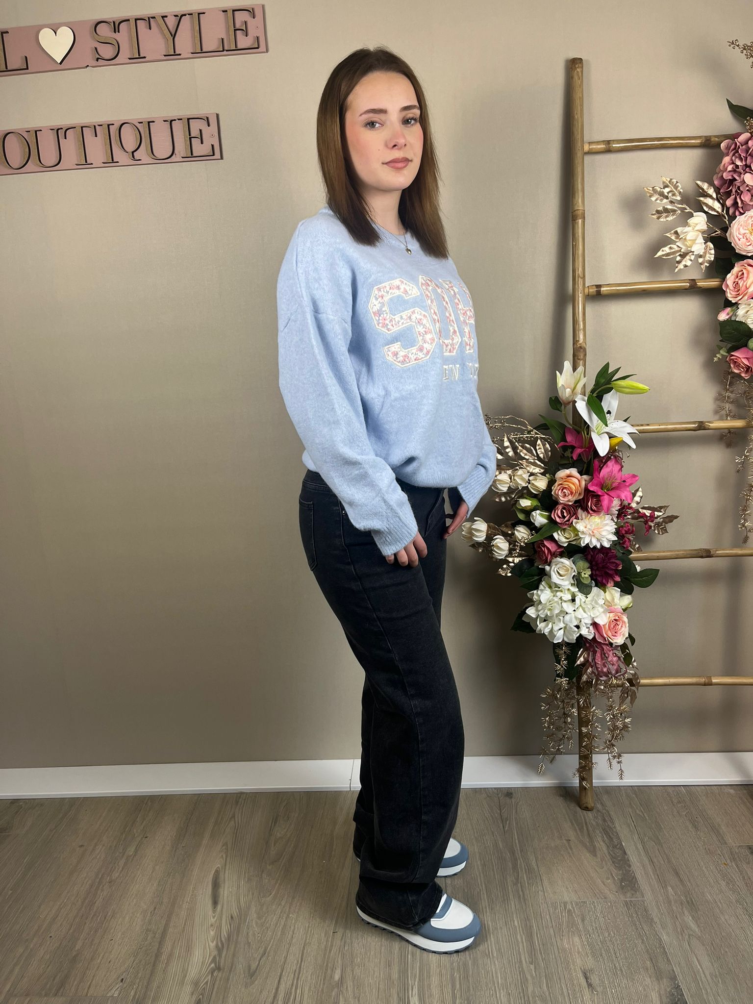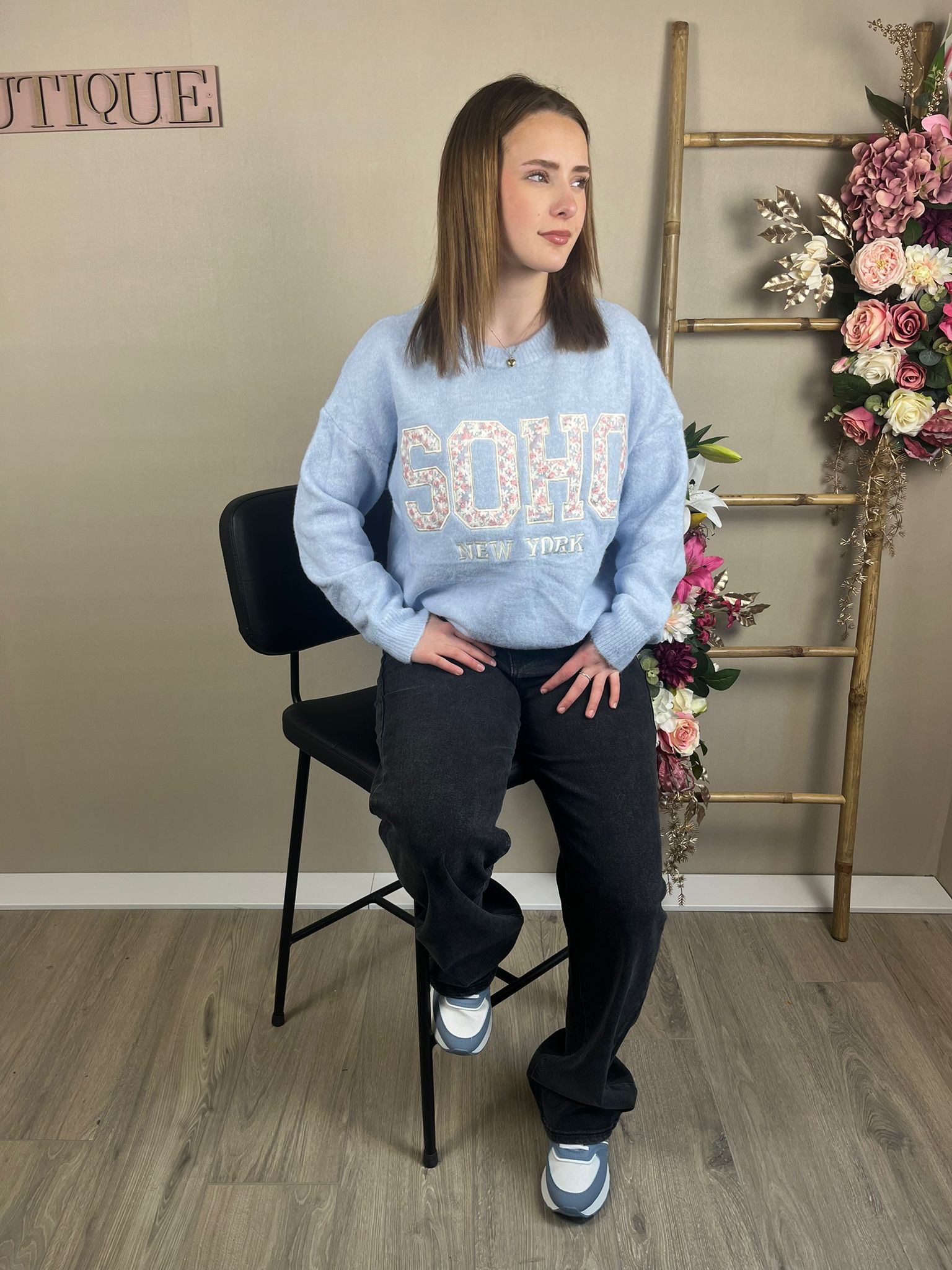 Stijlvolle, zachte lichtblauwe trui met SOHO New York print in een trendy bloemenpatroon. Comfortabele loose-fit met ronde hals – perfect voor elke dag.