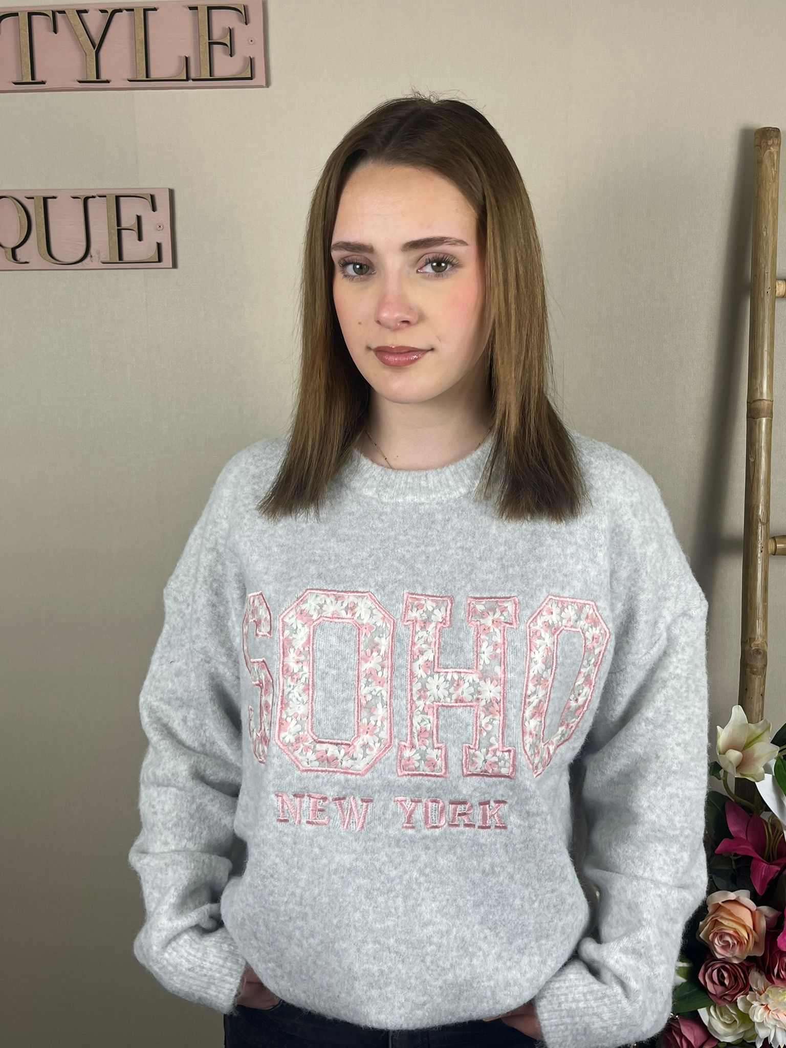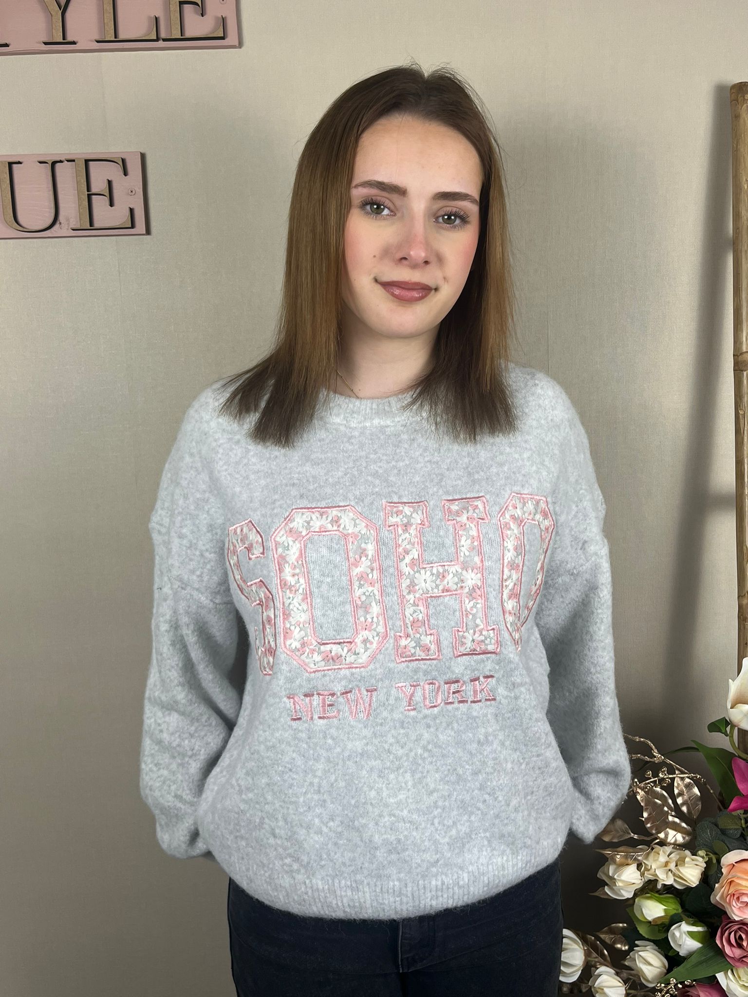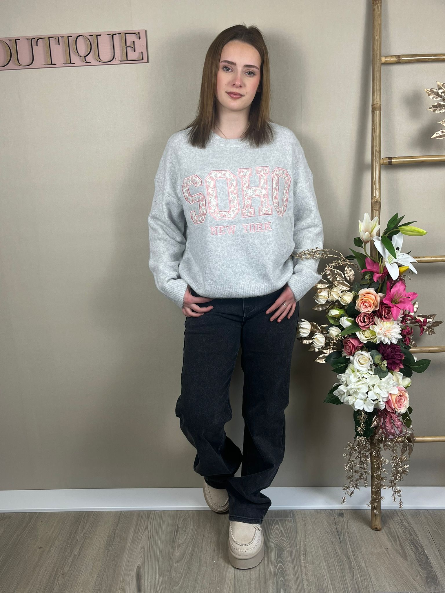 Stijlvolle, zachte lichtgrijze trui met SOHO New York print in een trendy bloemenpatroon. Comfortabele loose-fit met ronde hals – perfect voor elke dag.