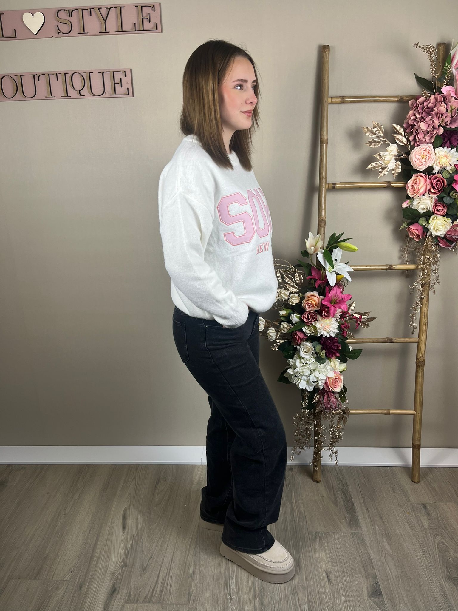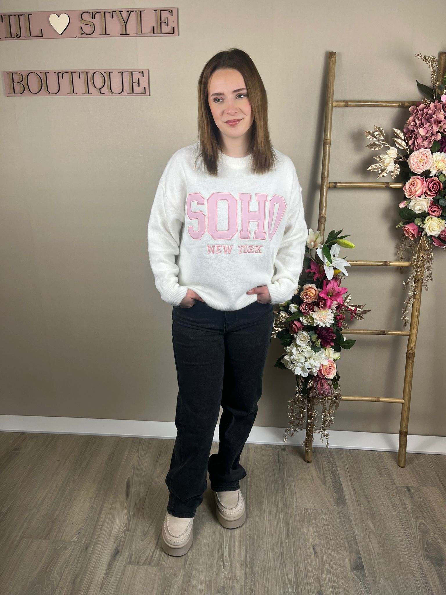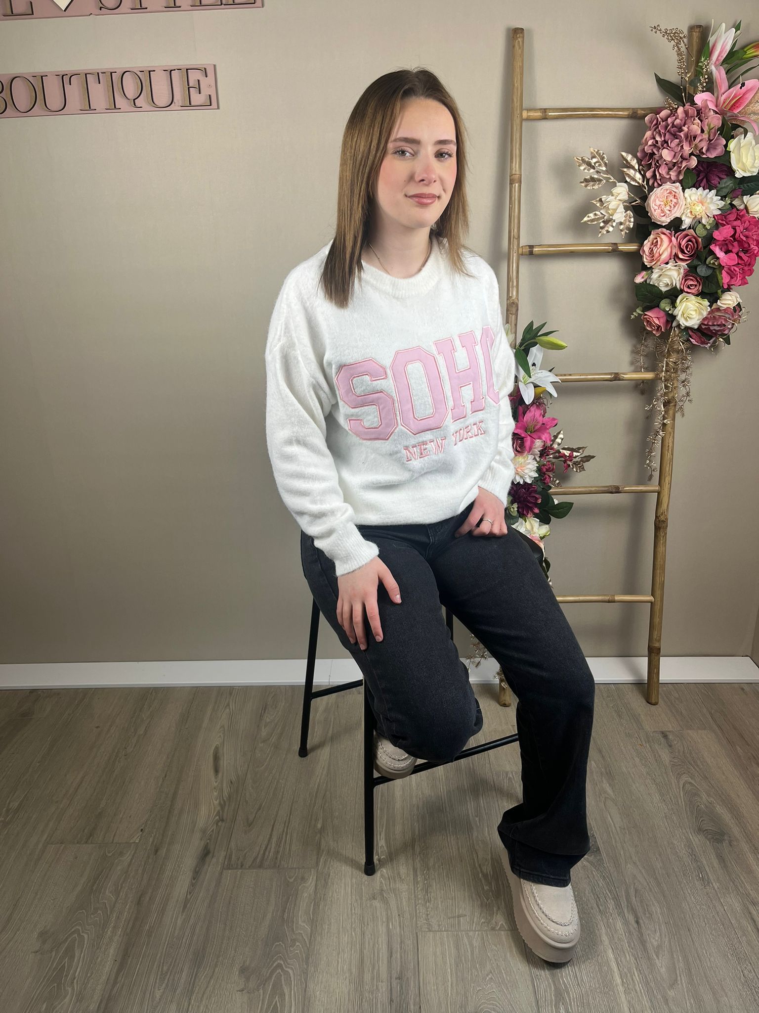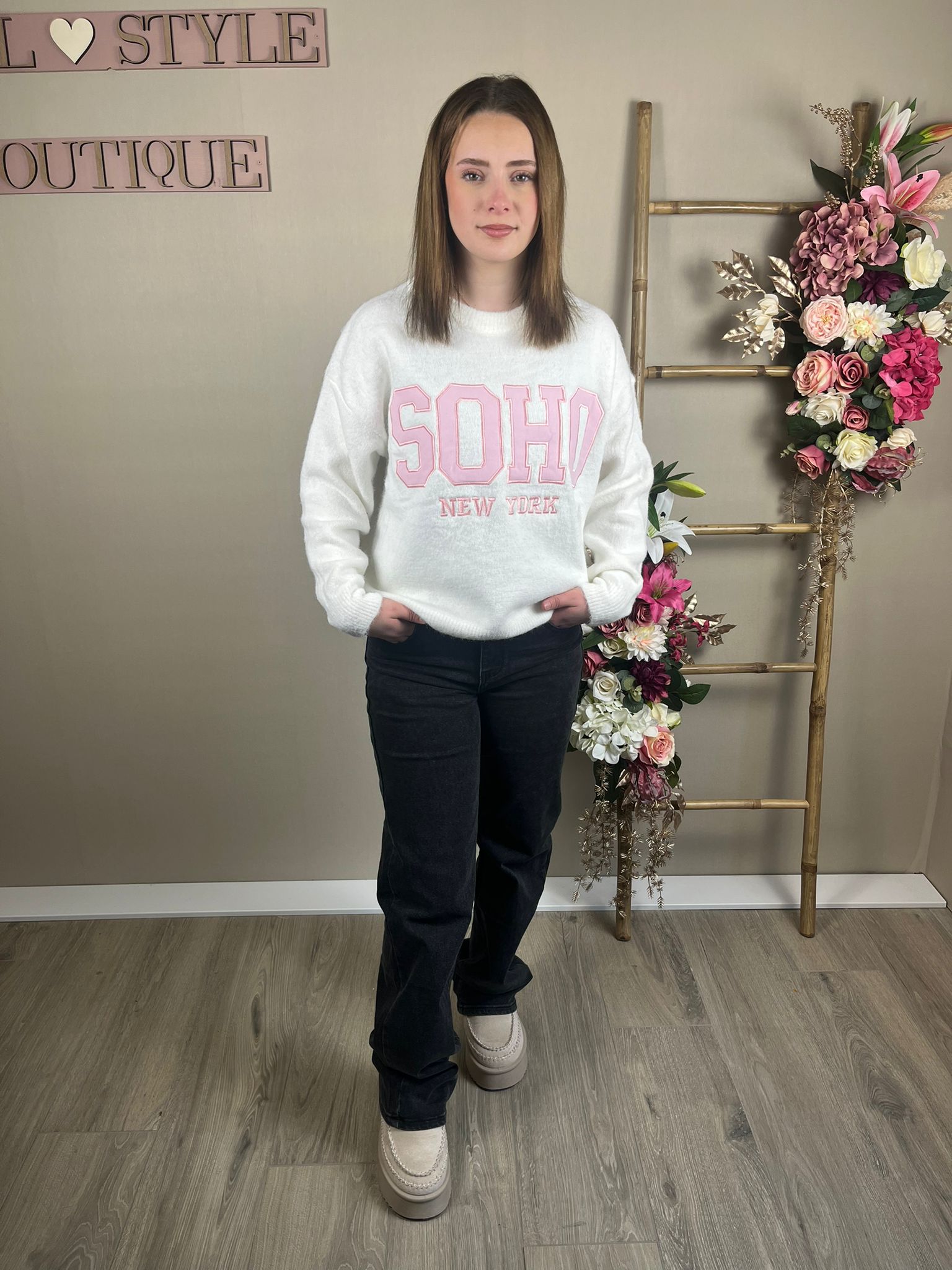 Stijlvolle Soho New York Cozy Sweater in een zachte, gebroken witte kleur met trendy roze lettering. Deze comfortabele trui heeft een relaxte fit, voelt heerlijk warm aan en is perfect voor een casual, fashionable look. Combineer moeiteloos met jeans of een rok voor een stijlvolle everyday outfit.