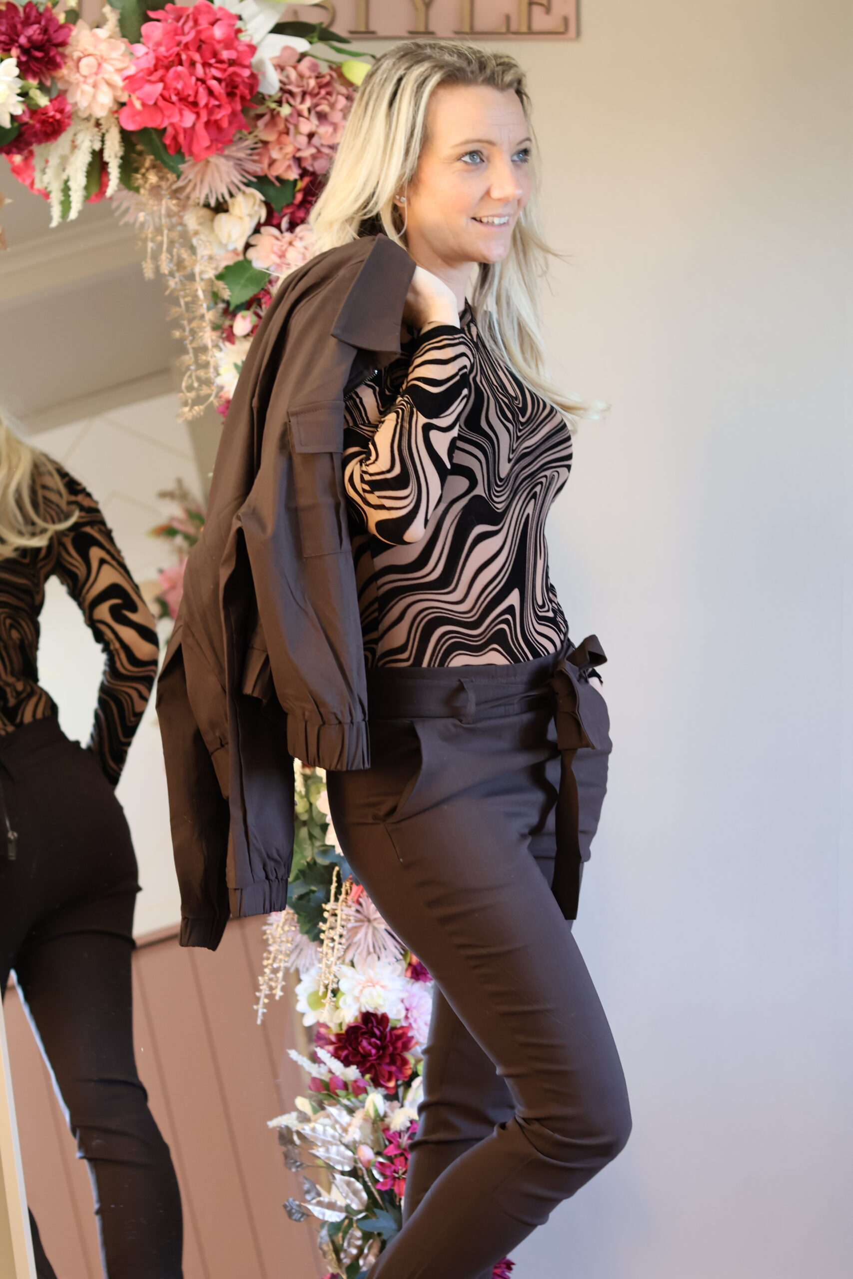Dit elegante bruine damesjasje is de perfecte combinatie van comfort en stijl. Het jasje heeft een clean, modern silhouet en een licht relaxte pasvorm die mooi aansluit zonder strak te zitten. De stevige maar zachte stof voelt luxe aan, valt soepel en behoudt zijn vorm – zelfs na veel dragen.
