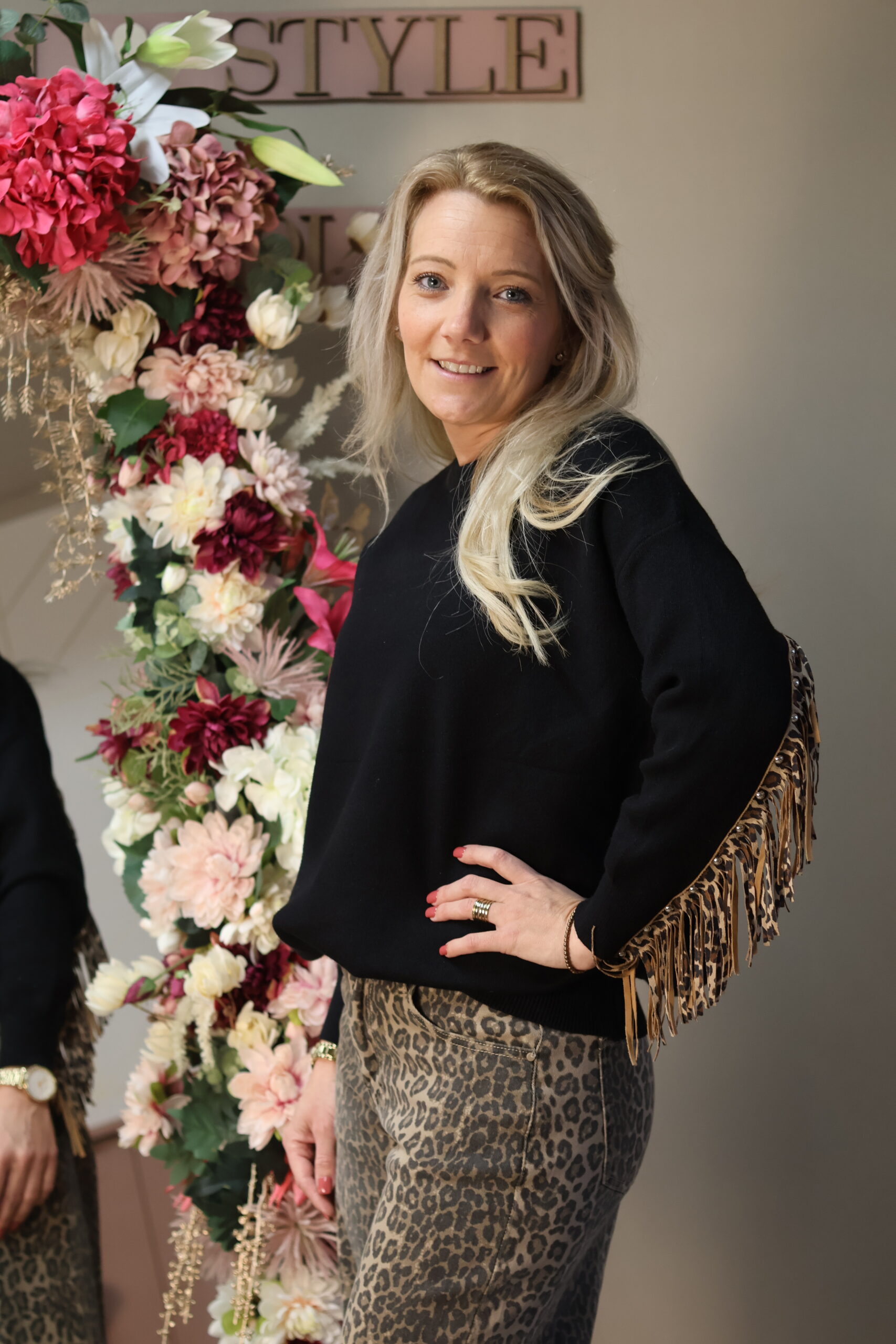 Zwarte trui met leopard details en speelse franjes over de rug én langs de armen. Een echte statement sweater met een stoere, vrouwelijke uitstraling.